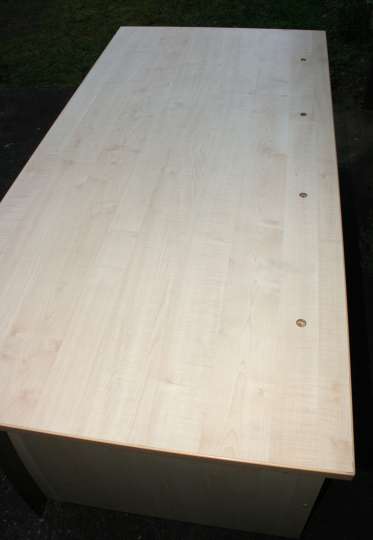Es handelt sich um einen modernen Schreibtisch mit Ahornfolierung. Breite 160 cm, Höhe 73 cm und Tiefe 80 cm.