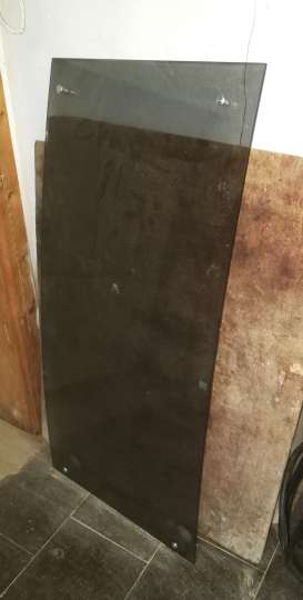 Die Breite ist 134 cm, die Höhe ist 120 cm, die obere Tiefe 42 cm, die untere 59 cm. Die Glasschiebetür hat einen kleinen Fehler.