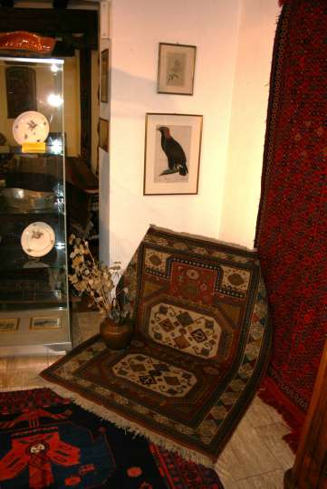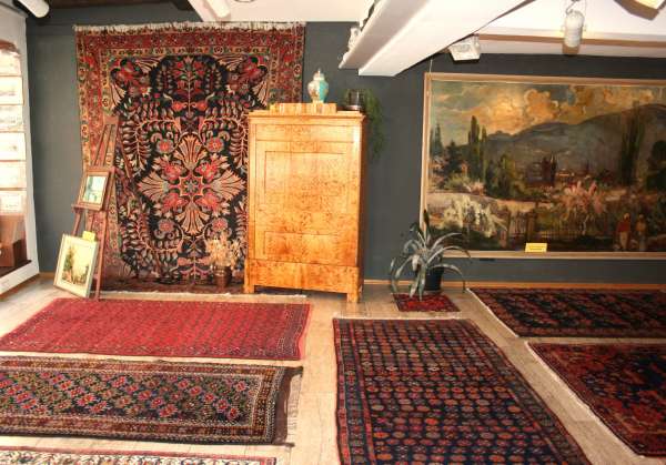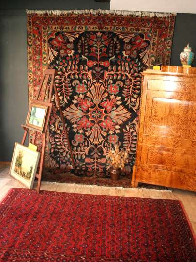 Helle freundliche Biedermeiermöbel zusammen mit wunderbaren pflanzengefärbten, freundlichen Teppichen.