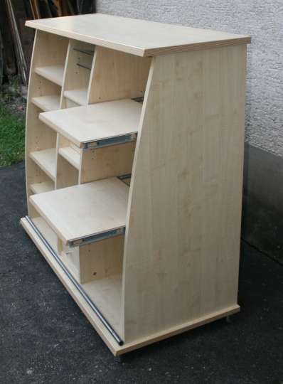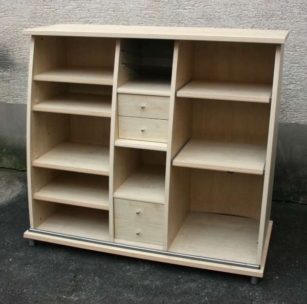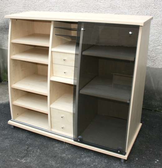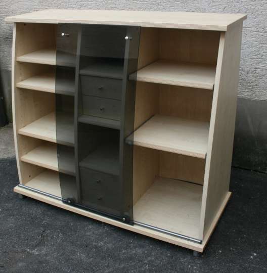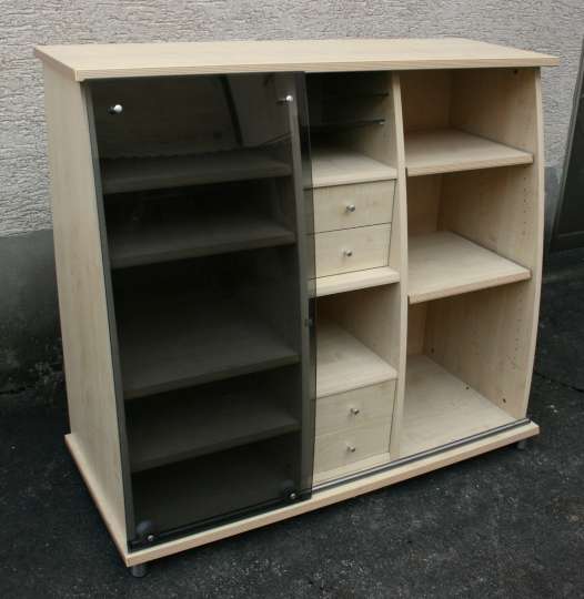 Ein Sideboard/Büromöbel mit geschweifter Front und Glasschiebetür. Auch dieses Möbel ist mit Ahornfolierung versehen.
