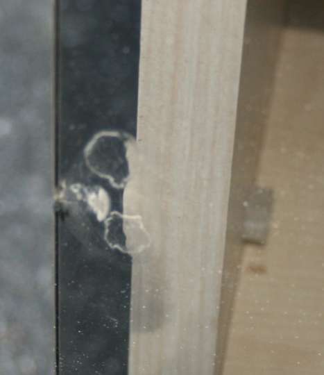 Die Breite ist 134 cm, die Höhe ist 120 cm, die obere Tiefe 42 cm, die untere 59 cm. Die Glasschiebetür hat einen kleinen Fehler.