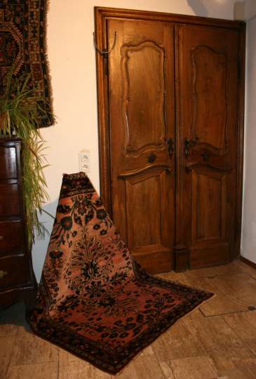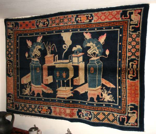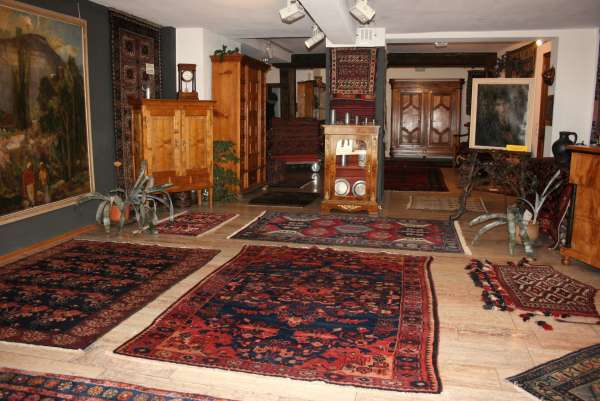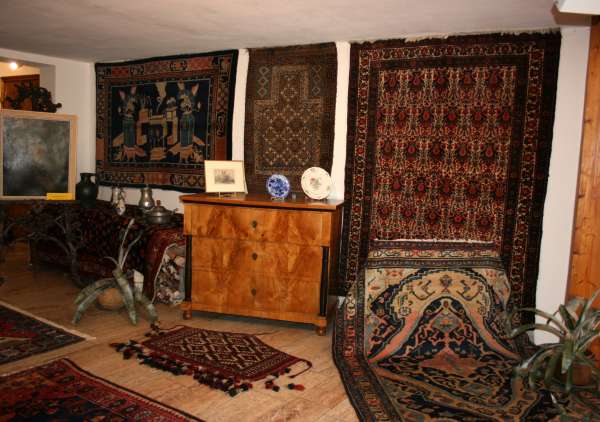 Helle freundliche Biedermeiermöbel zusammen mit wunderbaren pflanzengefärbten, freundlichen Teppichen.