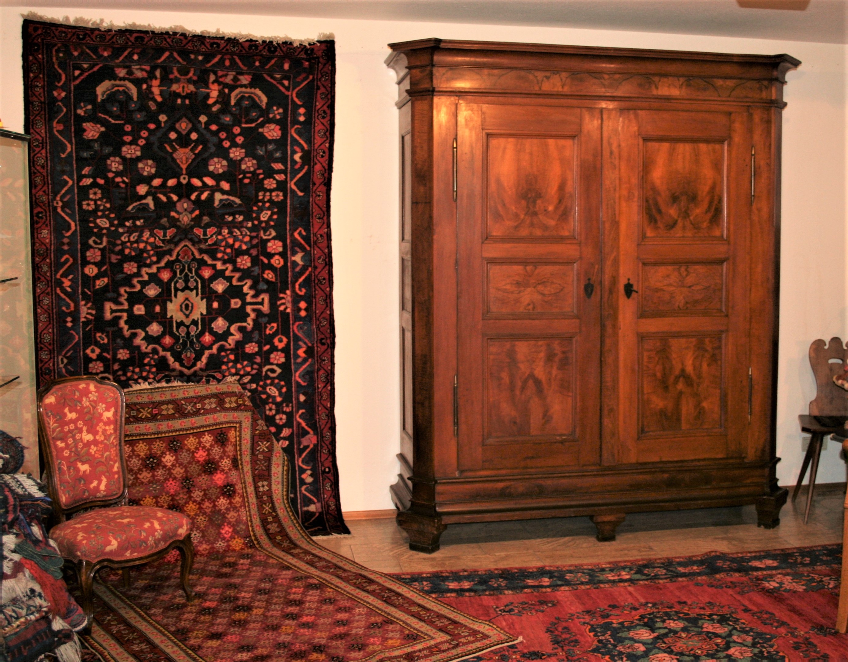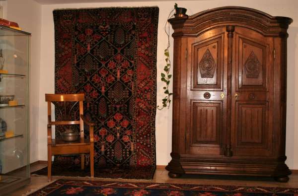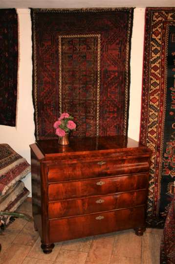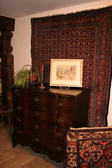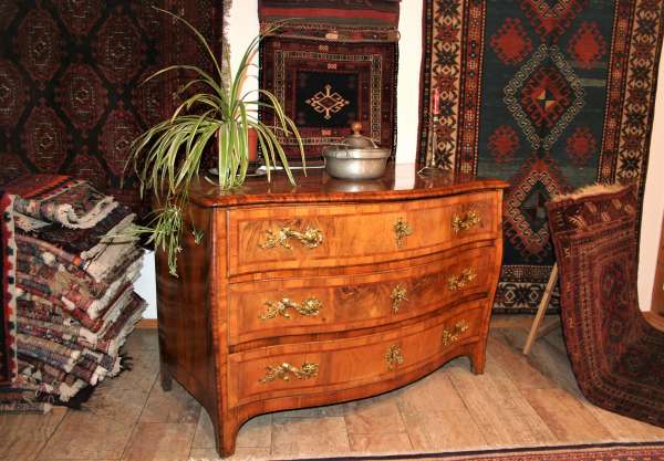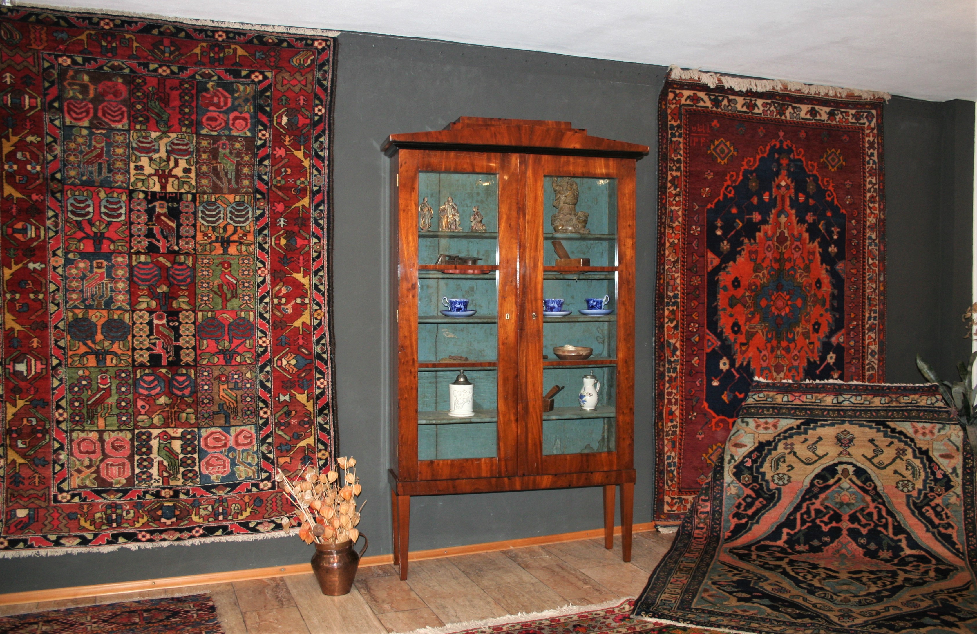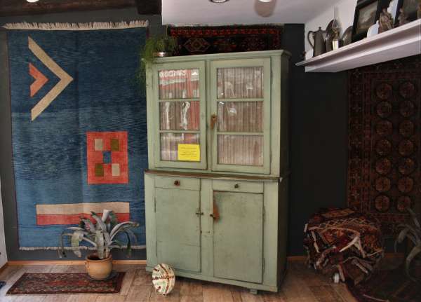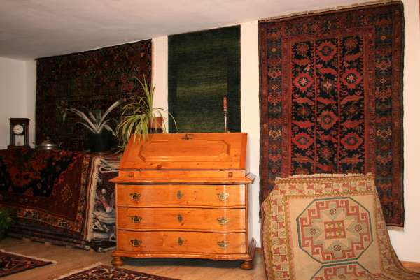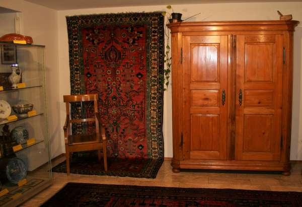 Bei den Teppichen zeigen wir antike Mafrascharbeiten, zu denen wir unsere pflanzengefärbten Teppichraritäten ausstellen; zum Teil erstmalig bei uns im Schaufenster. Bei den Möbeln sind es dieses Mal interessante Mahagonie Möbel, die in der Pfalz sehr selten anzutreffen sind. Ein wunderbarer Klappsekretär mit einem einzigartigen Innenleben und zahlreichen Geheimfächern, ein kleiner ausklappbarer Spieltisch, eine feine, in der Front gebauchte Kommode, eine sehr schön proportionierte Vitrine, mit originalen Gläsern und Innenleben und einen hochwertigen, original erhaltenen, Pfälzer Kirschbaumschrank.