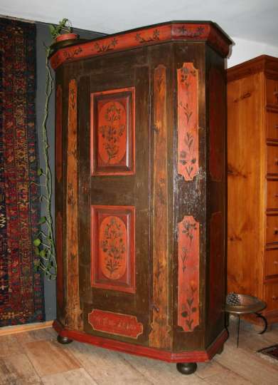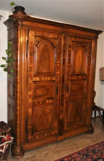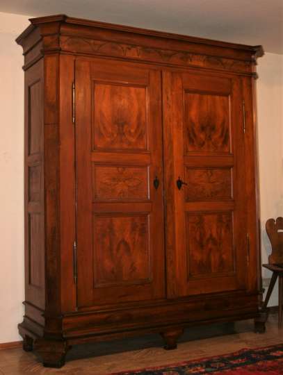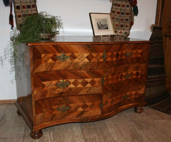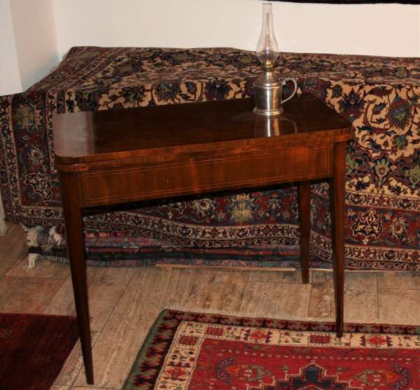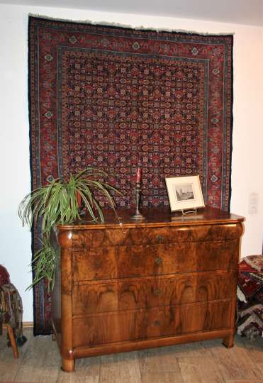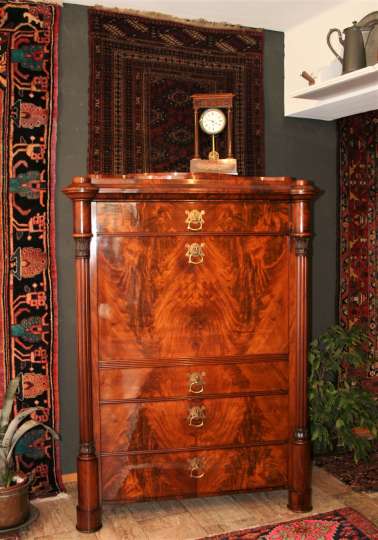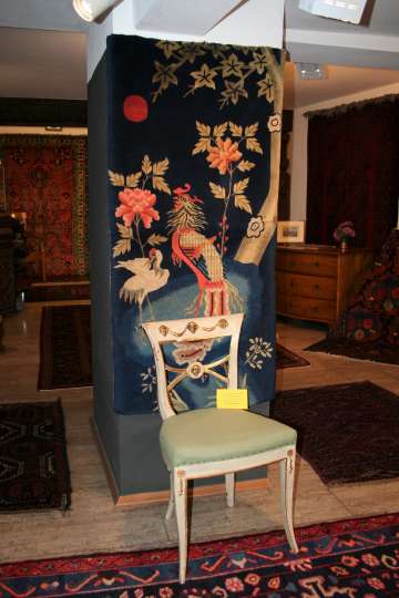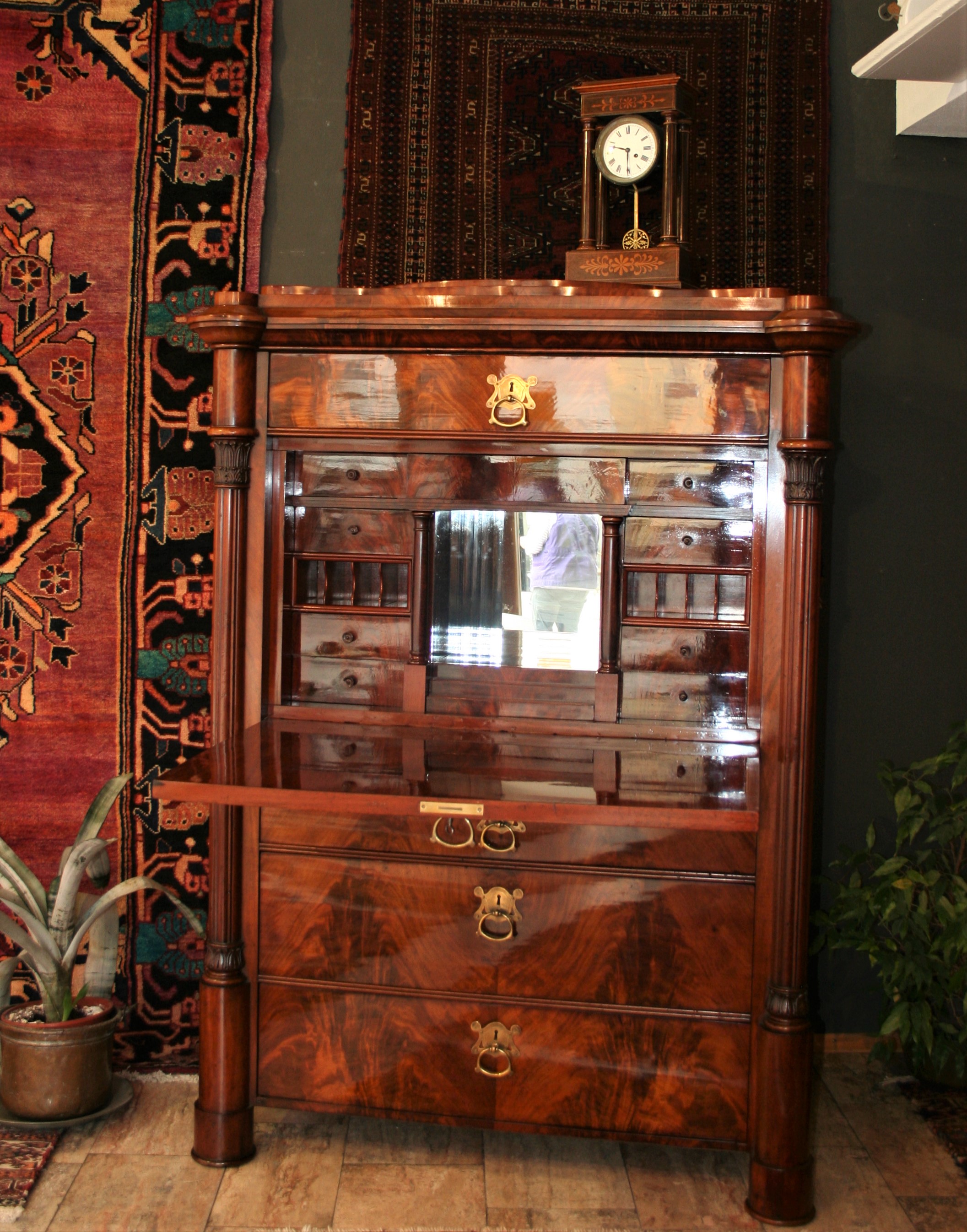 Bei den Teppichen zeigen wir antike Mafrascharbeiten, zu denen wir unsere pflanzengefärbten Teppichraritäten ausstellen; zum Teil erstmalig bei uns im Schaufenster. Bei den Möbeln sind es dieses Mal interessante Mahagonie Möbel, die in der Pfalz sehr selten anzutreffen sind. Ein wunderbarer Klappsekretär mit einem einzigartigen Innenleben und zahlreichen Geheimfächern, ein kleiner ausklappbarer Spieltisch, eine feine, in der Front gebauchte Kommode, eine sehr schön proportionierte Vitrine, mit originalen Gläsern und Innenleben und einen hochwertigen, original erhaltenen, Pfälzer Kirschbaumschrank.
