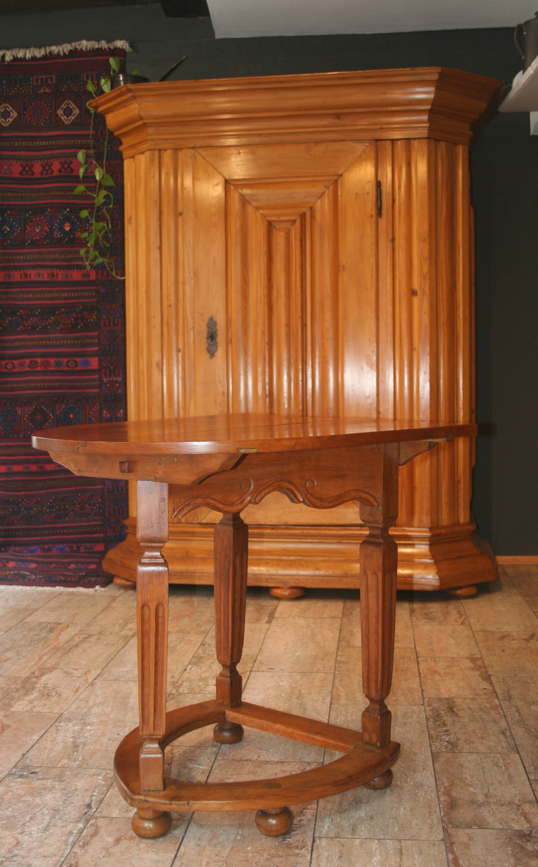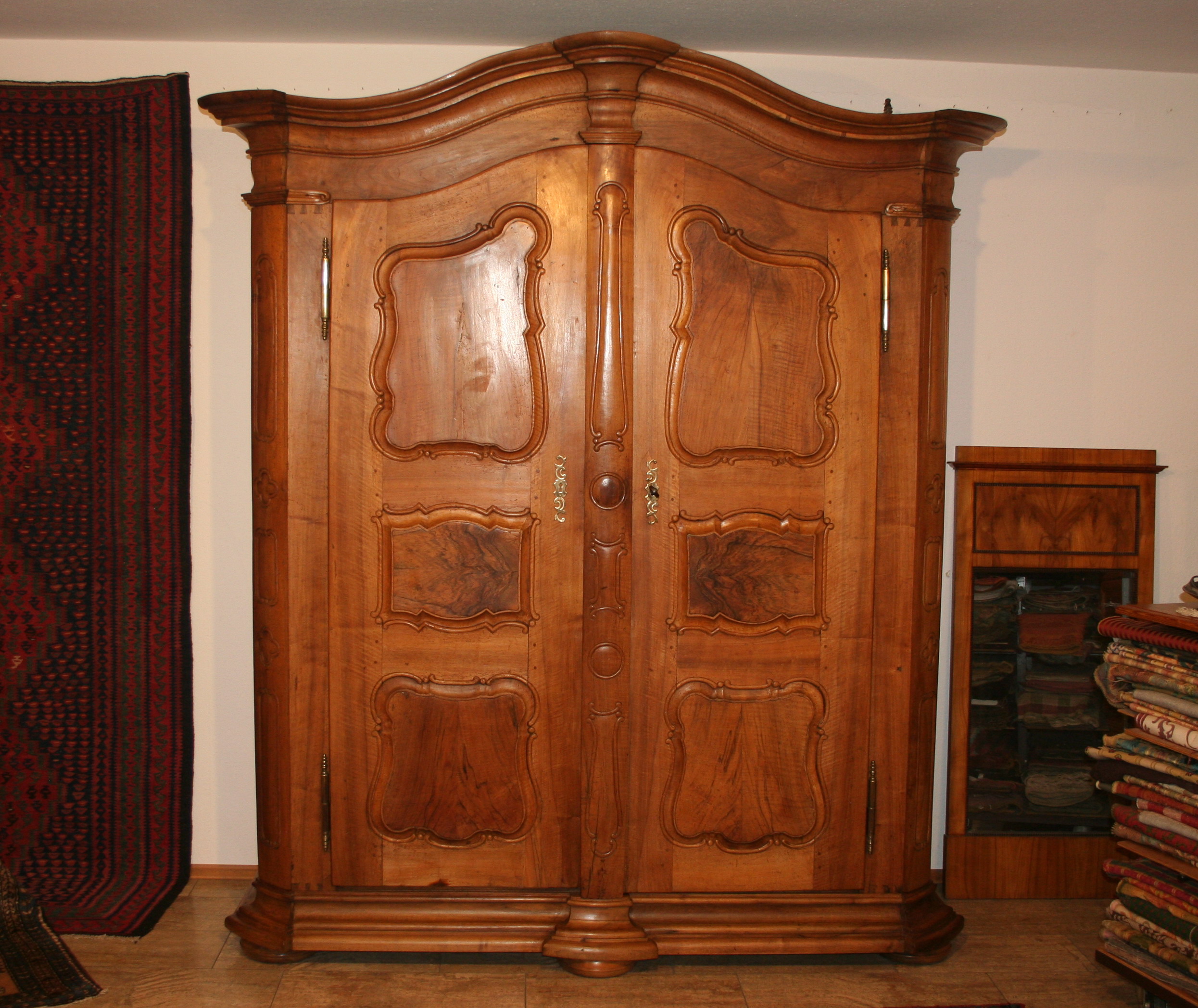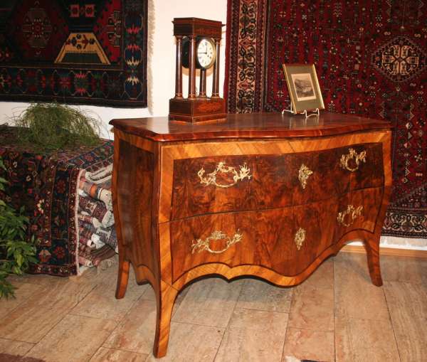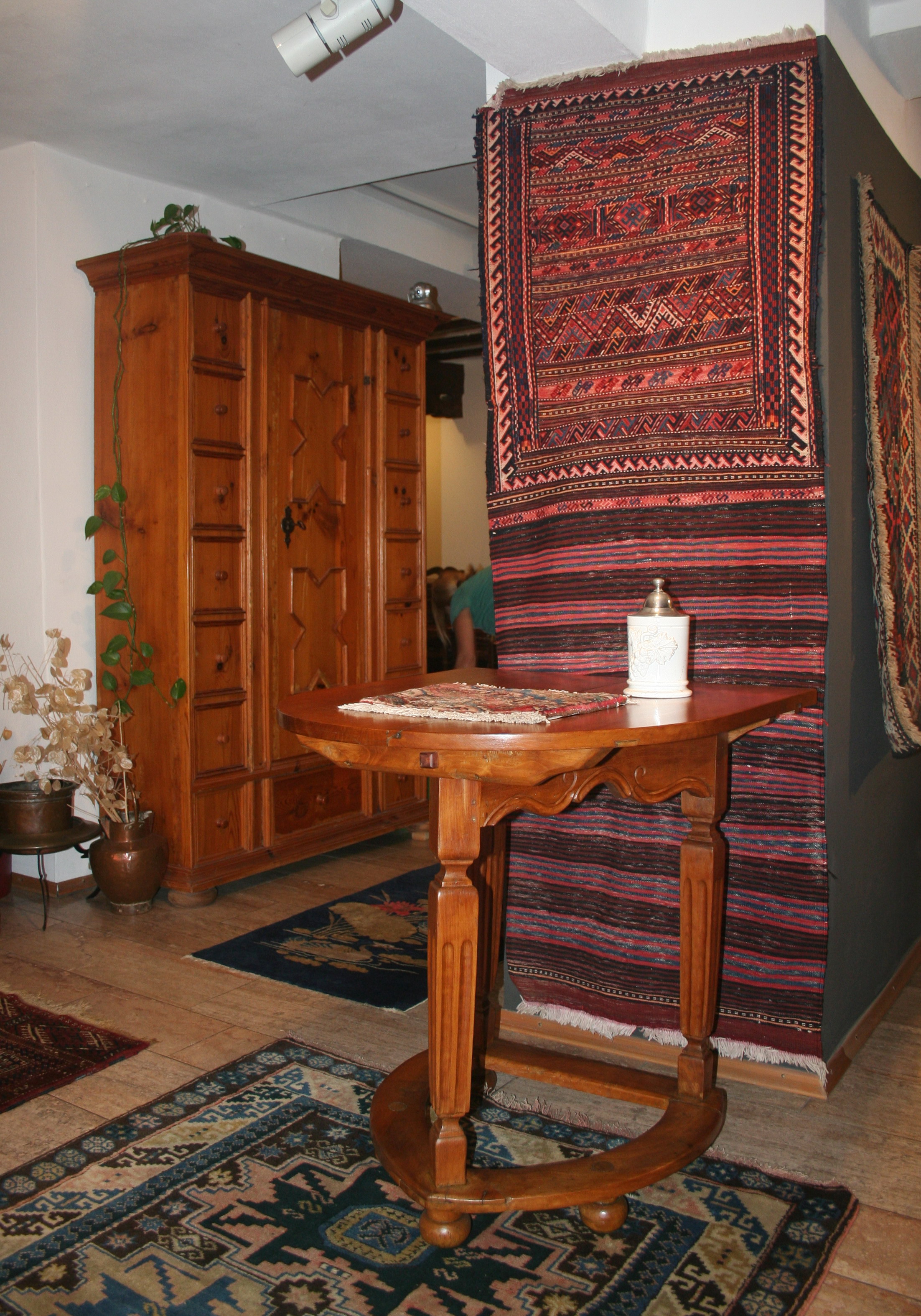 Jetzt, wo es wärmer und heller wird, haben wir uns für interessante, helle Weichholzmöbel aus dem 18. Jahrhundert entschieden. Frisch aus unserer Restaurierungswerkstatt kommt ein seltener, eintüriger Frankfurter-Wellenschrank mit profilierten Seiten und Lisenen aus der Mitte des 18.Jahrhunderts. Schlüssel, Schlüsselschild und Schloss sind original und sehr gut erhalten. Dazu ausgestellt haben wir eine barocke Schreibkommode aus Weichholz, einen Barock-Weichholzschrank aus der Pfalz und eine dreischübige Weichholz-Barockkommode mit einer feinen Schweifung. Da wir Ihnen ja in unserem Jubiläumsjahr jeden Monat Besonderheiten versprochen haben, zeigen wir dazu antike Kelims, Taschen und orientalische Volkskunst in perfekter Erhaltung, mit reinen Pflanzenfarben gefärbt und mit allerbesten Hochlandwollen meisterhaft gearbeitet. Alle unsere Teppichraritäten sind über Jahrzehnte direkt in den Ursprungsländern zusammengetragen. Es sind ausnahmslos Einzelstücke mit hohem kulturellen Wert.