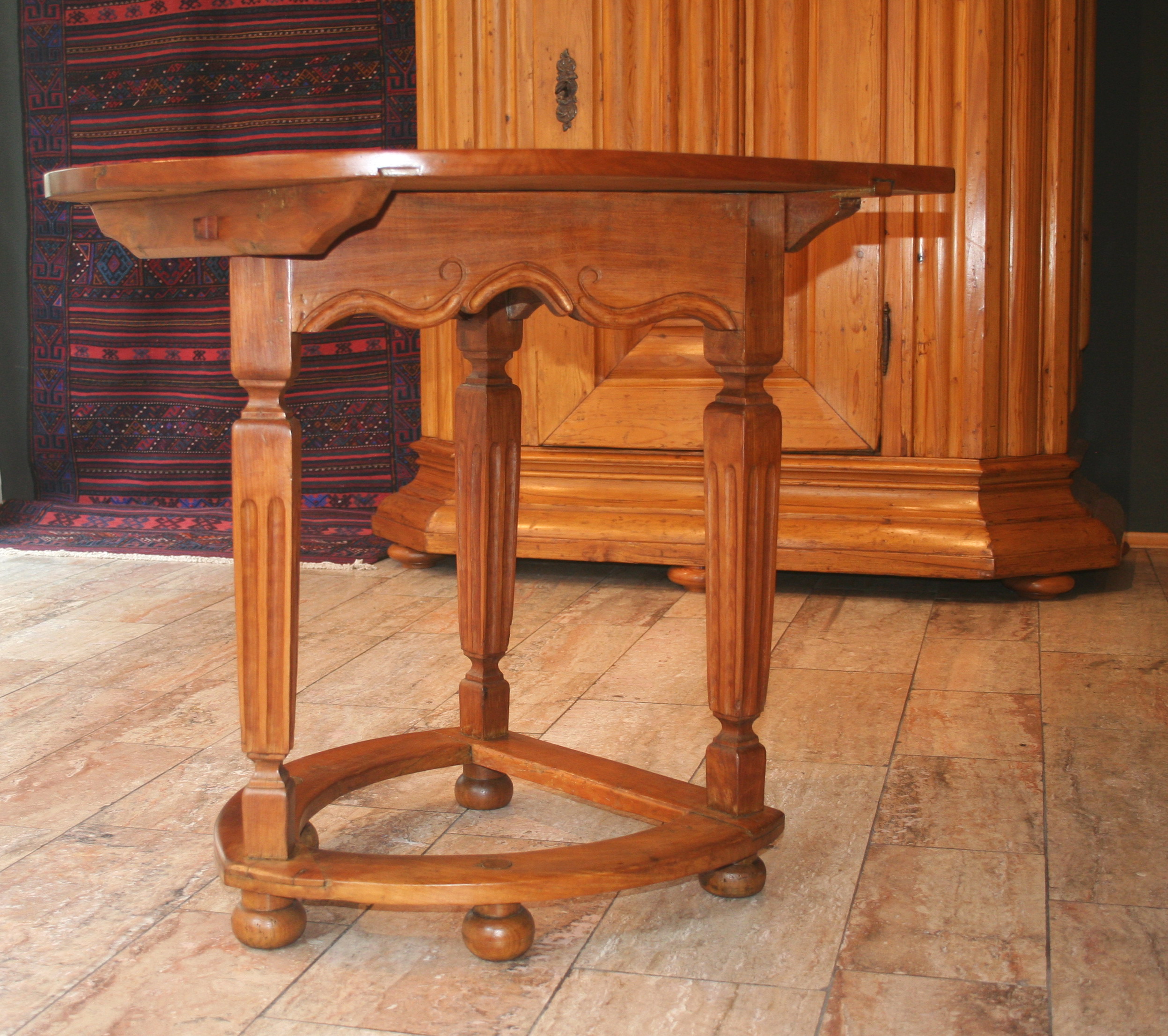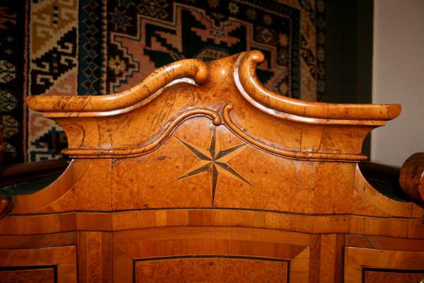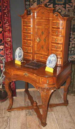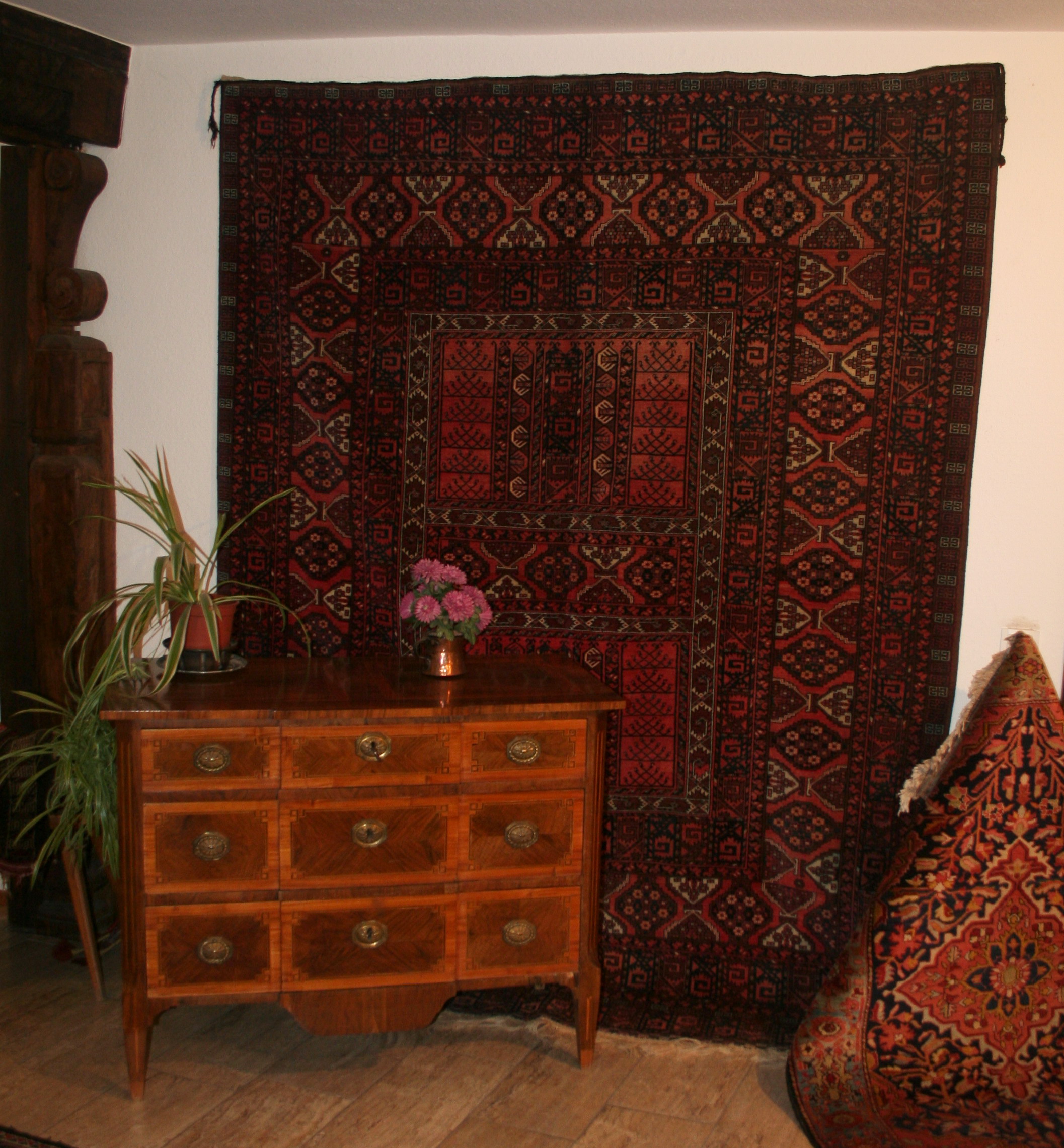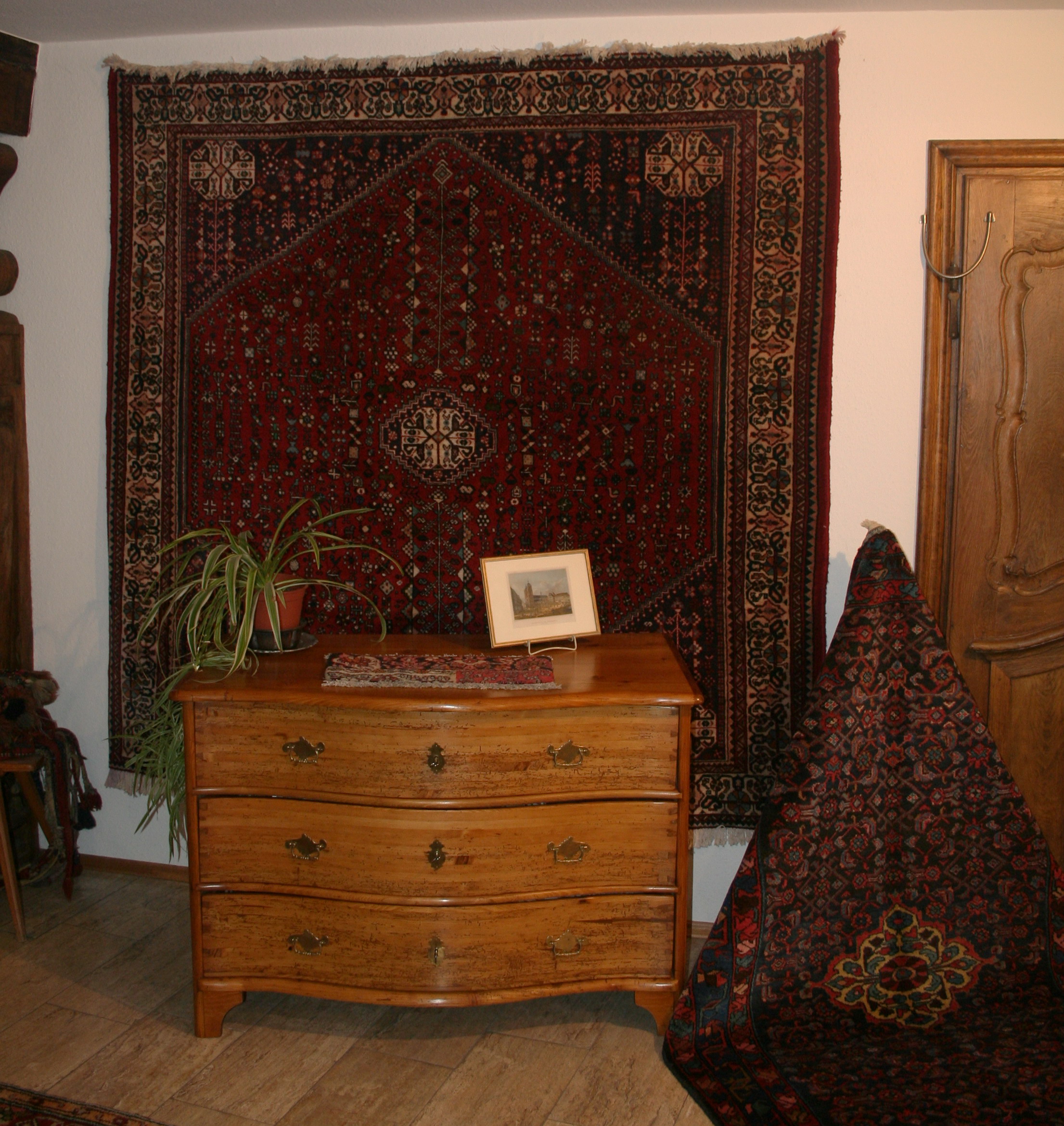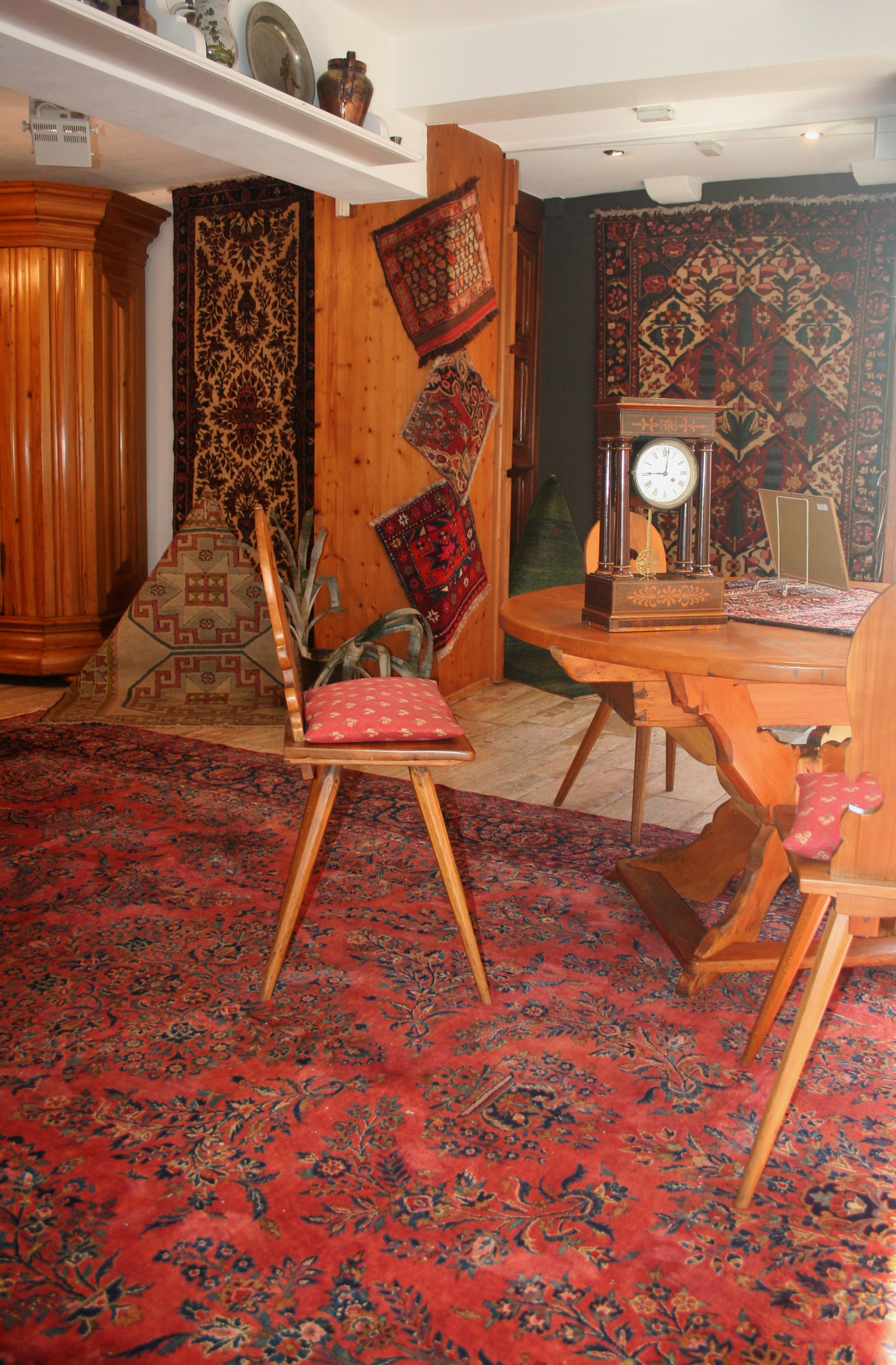 Jetzt, wo es wärmer und heller wird, haben wir uns für interessante, helle Weichholzmöbel aus dem 18. Jahrhundert entschieden. Frisch aus unserer Restaurierungswerkstatt kommt ein seltener, eintüriger Frankfurter-Wellenschrank mit profilierten Seiten und Lisenen aus der Mitte des 18.Jahrhunderts. Schlüssel, Schlüsselschild und Schloss sind original und sehr gut erhalten. Dazu ausgestellt haben wir eine barocke Schreibkommode aus Weichholz, einen Barock-Weichholzschrank aus der Pfalz und eine dreischübige Weichholz-Barockkommode mit einer feinen Schweifung. Da wir Ihnen ja in unserem Jubiläumsjahr jeden Monat Besonderheiten versprochen haben, zeigen wir dazu antike Kelims, Taschen und orientalische Volkskunst in perfekter Erhaltung, mit reinen Pflanzenfarben gefärbt und mit allerbesten Hochlandwollen meisterhaft gearbeitet. Alle unsere Teppichraritäten sind über Jahrzehnte direkt in den Ursprungsländern zusammengetragen. Es sind ausnahmslos Einzelstücke mit hohem kulturellen Wert.