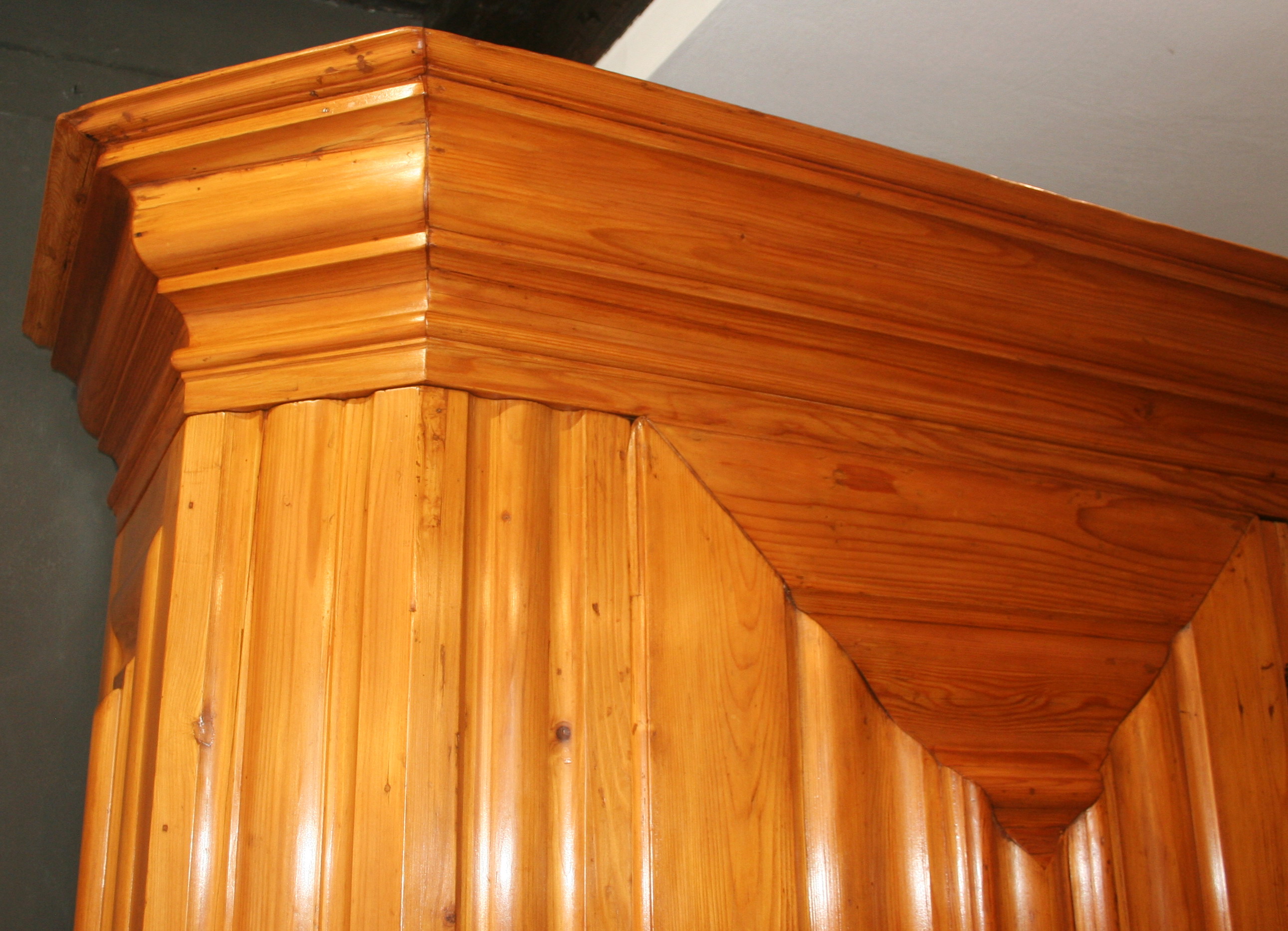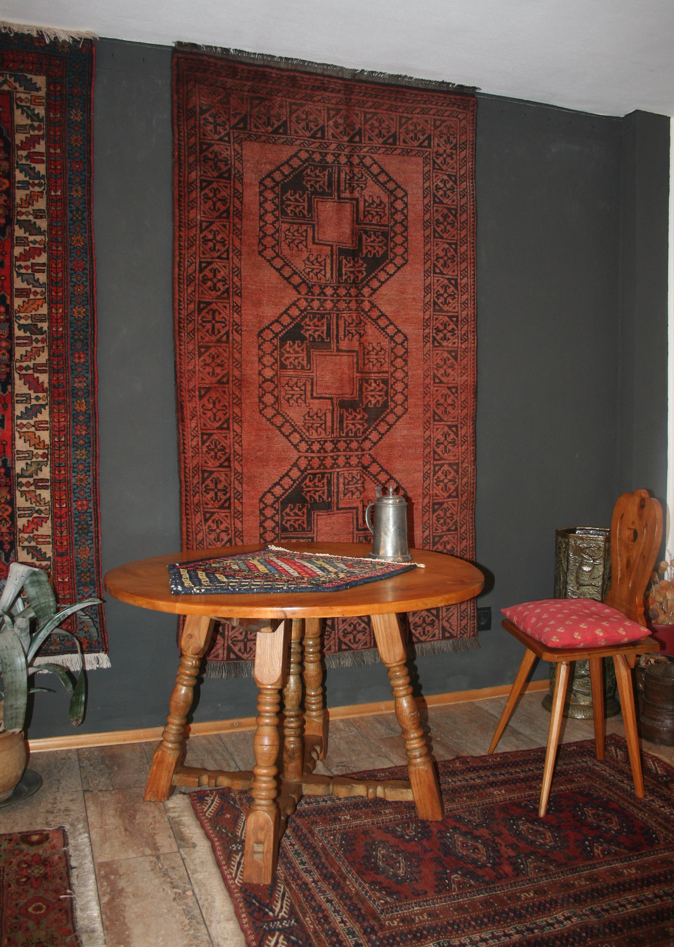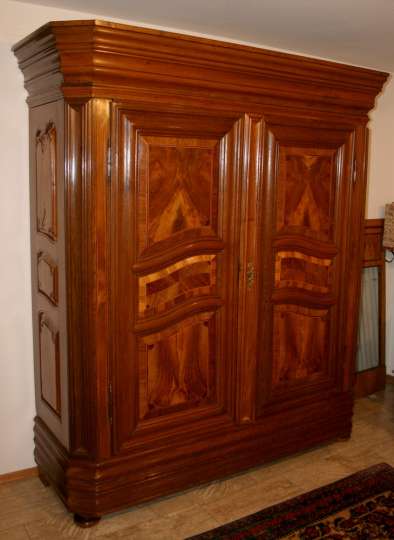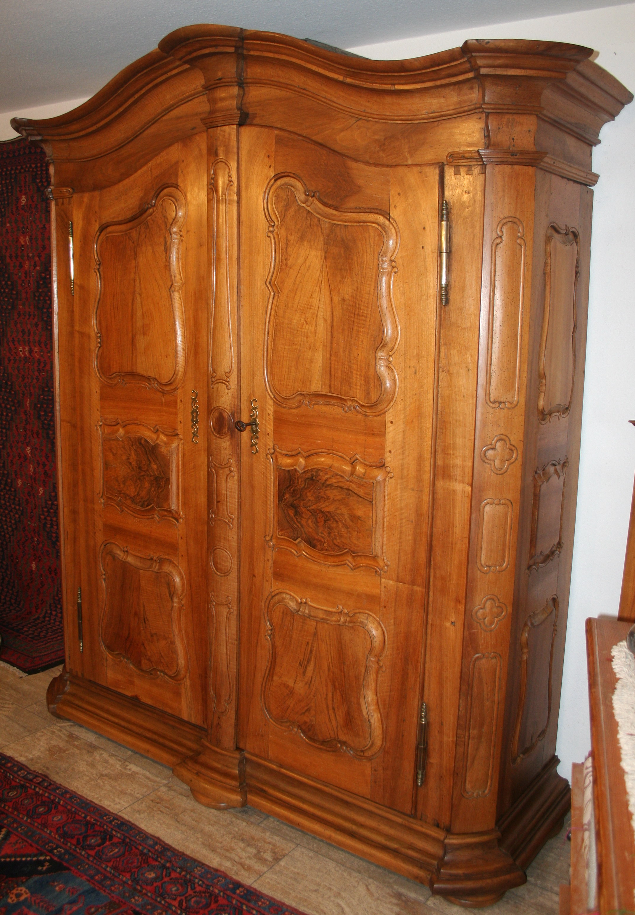 Jetzt, wo es wärmer und heller wird, haben wir uns für interessante, helle Weichholzmöbel aus dem 18. Jahrhundert entschieden. Frisch aus unserer Restaurierungswerkstatt kommt ein seltener, eintüriger Frankfurter-Wellenschrank mit profilierten Seiten und Lisenen aus der Mitte des 18.Jahrhunderts. Schlüssel, Schlüsselschild und Schloss sind original und sehr gut erhalten. Dazu ausgestellt haben wir eine barocke Schreibkommode aus Weichholz, einen Barock-Weichholzschrank aus der Pfalz und eine dreischübige Weichholz-Barockkommode mit einer feinen Schweifung. Da wir Ihnen ja in unserem Jubiläumsjahr jeden Monat Besonderheiten versprochen haben, zeigen wir dazu antike Kelims, Taschen und orientalische Volkskunst in perfekter Erhaltung, mit reinen Pflanzenfarben gefärbt und mit allerbesten Hochlandwollen meisterhaft gearbeitet. Alle unsere Teppichraritäten sind über Jahrzehnte direkt in den Ursprungsländern zusammengetragen. Es sind ausnahmslos Einzelstücke mit hohem kulturellen Wert.