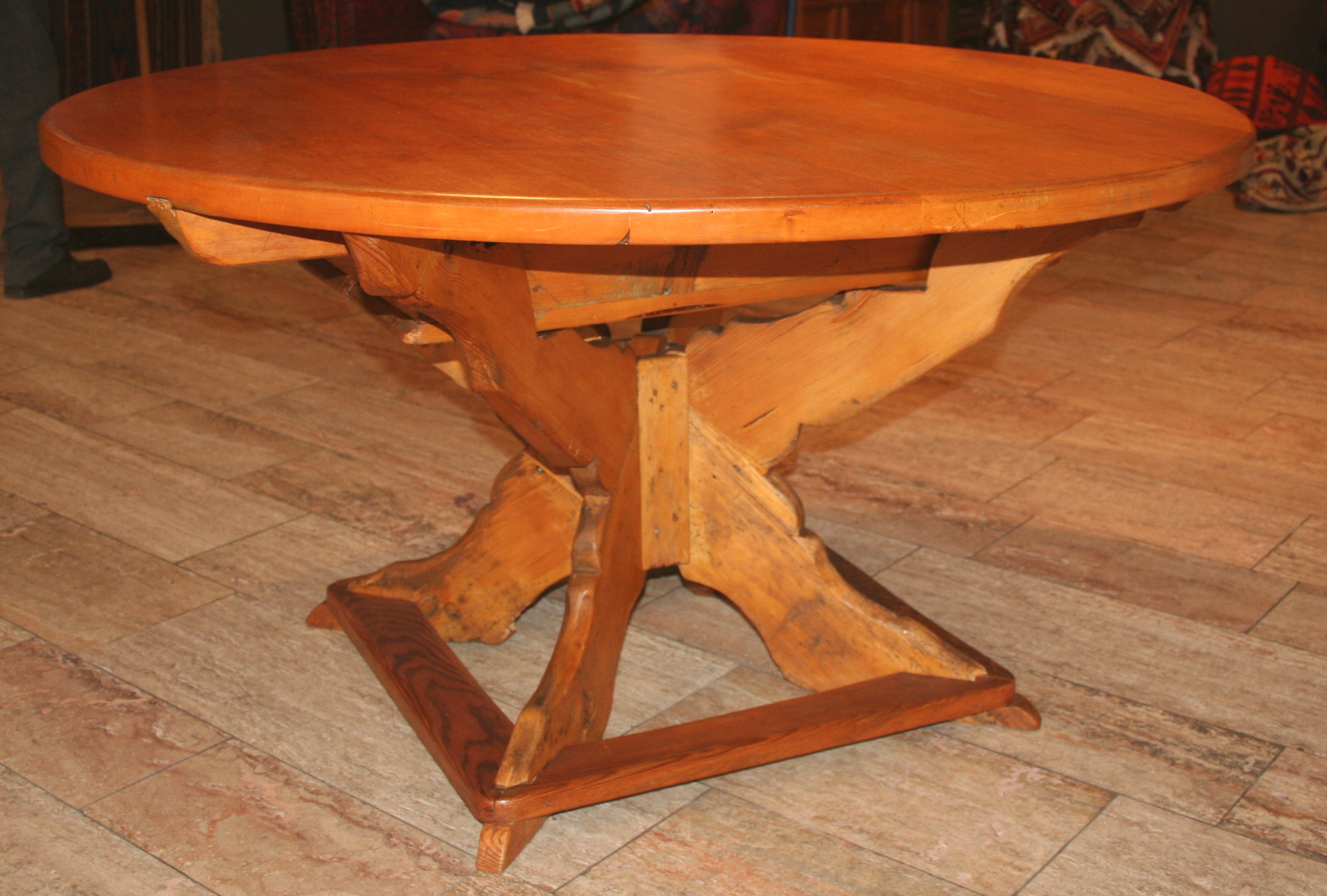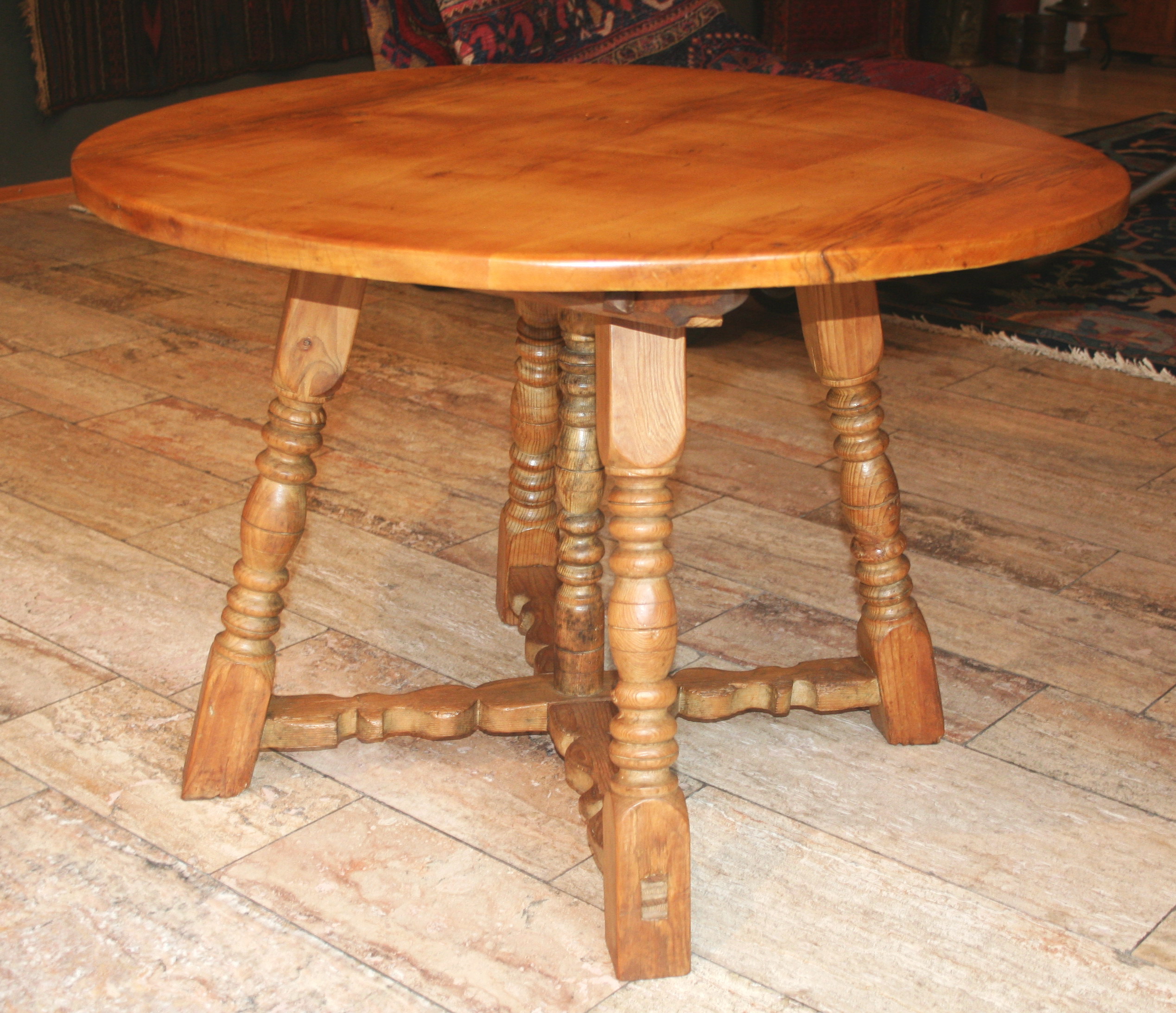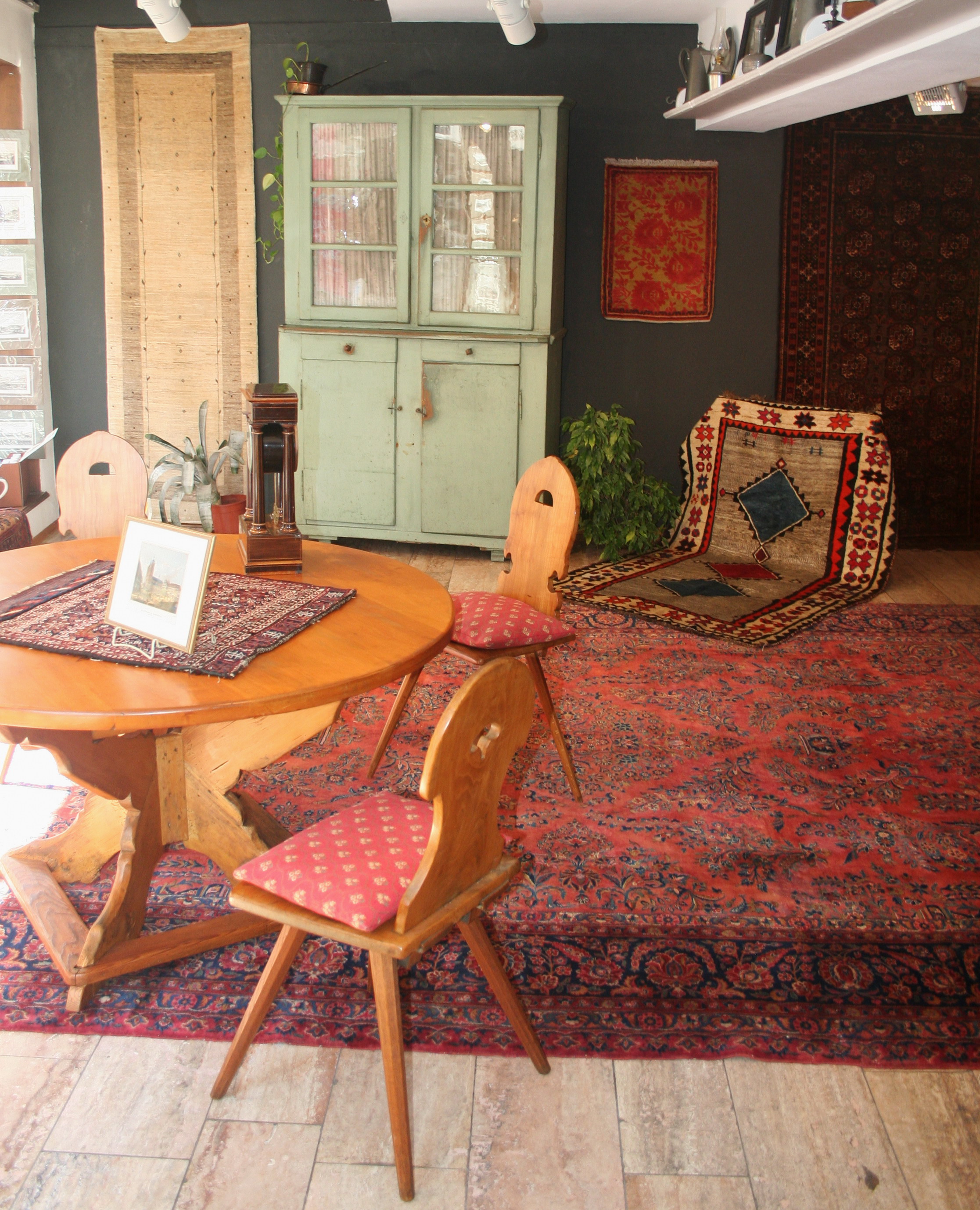 Wir stellen "Neues" aus unserer Restaurierungswerkstatt erstmalig direkt im Schaufenster aus. Eine Sammlung von seltenen, frühen Pfälzer Tischen. Ein besonders schöner und seltener Konsoltisch, massiv Kirschbaum, aus der Zeit um 1770, einen sehr seltenen, niedrigen, runden Beistelltisch mit einem gedrechselten Gestell aus Weichholz mit einer massiven Ahorntischplatte und ein Barockesstisch aus der Zeit um 1750/60 mit einem Gestell aus Weichholz und einer massiven runden Ahorntischplatte. Alle Tische haben die originalen Tischplatten und sind auch sonst sehr gut erhalten. Die passenden Pfälzer Weichholzmöbel haben wir entsprechend dazu ausgewählt, alles Möbel aus dem 18. Jahrhundert. Bei den Teppichen gibt es noch nie gezeigte Stücke zu sehen. Einen großen, antiken persischen Sarough, einen antiken, hellen Gabbeh mit leuchtenden Naturfarben, einen fast quadratischen Schiraz und etliche schwer zu findende Sondermaße. Die schönen Nomadenstücke, höchste Teppichkultur mit feinen Pflanzenfarben in perfekter Erhaltung kennen und finden Sie ja schon immer bei uns. Es lohnt sich also wieder, in unser Schaufenster zu schauen das jetzt schon im 90. Jahr, eigentümergeführt durch unsere Familie, im eigenen Geschäftshaus von 1574 gepflegt wird.