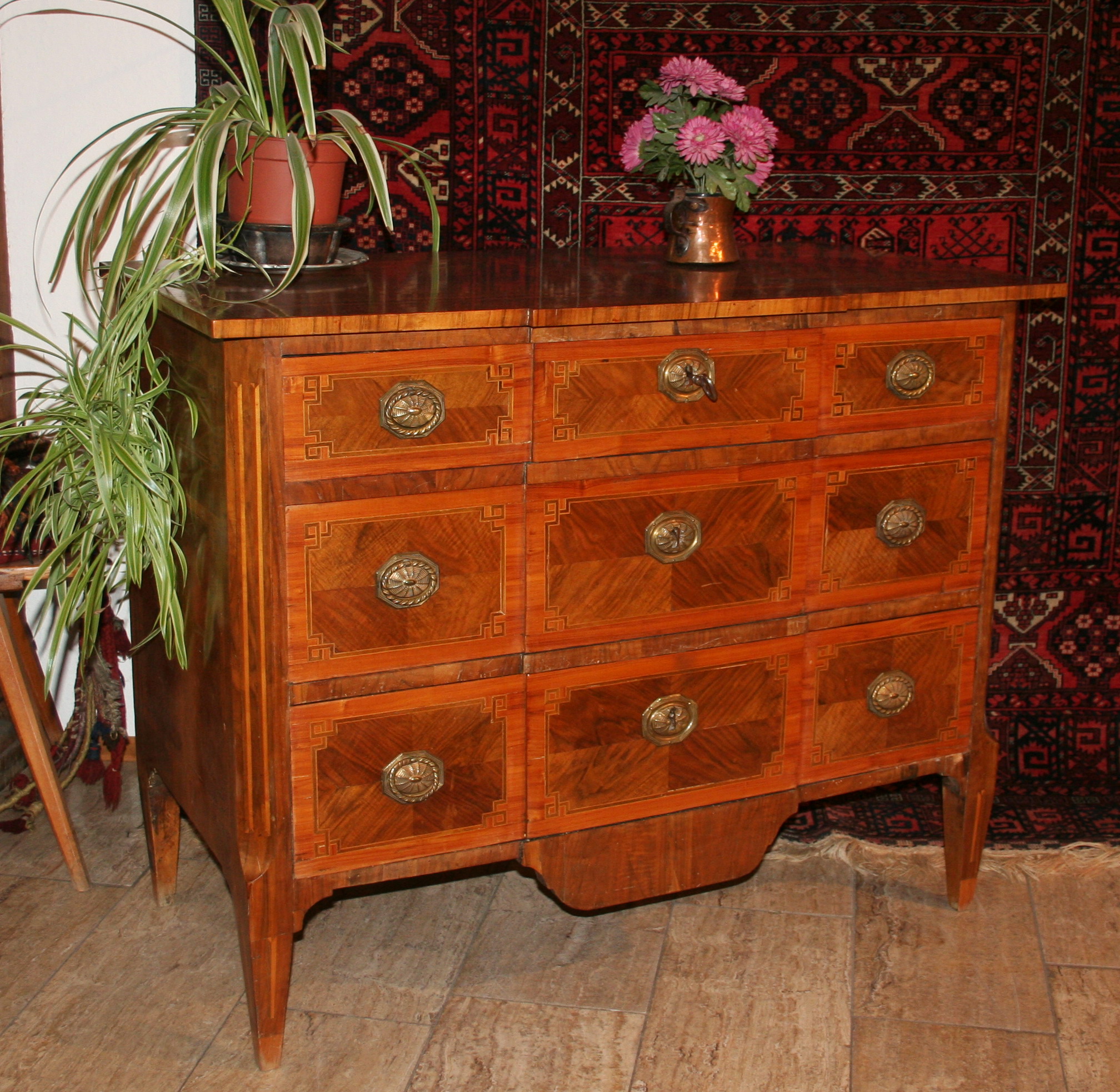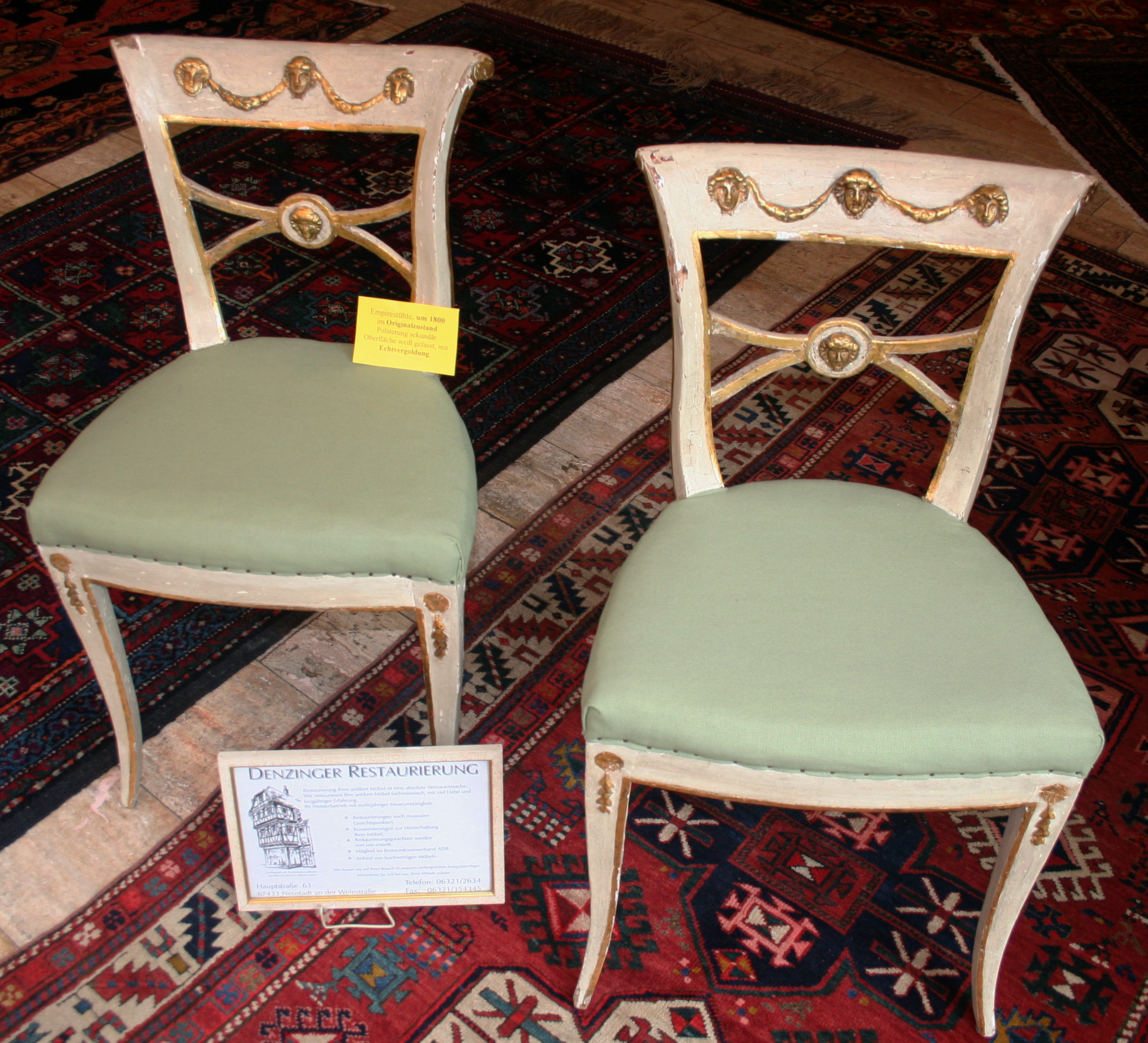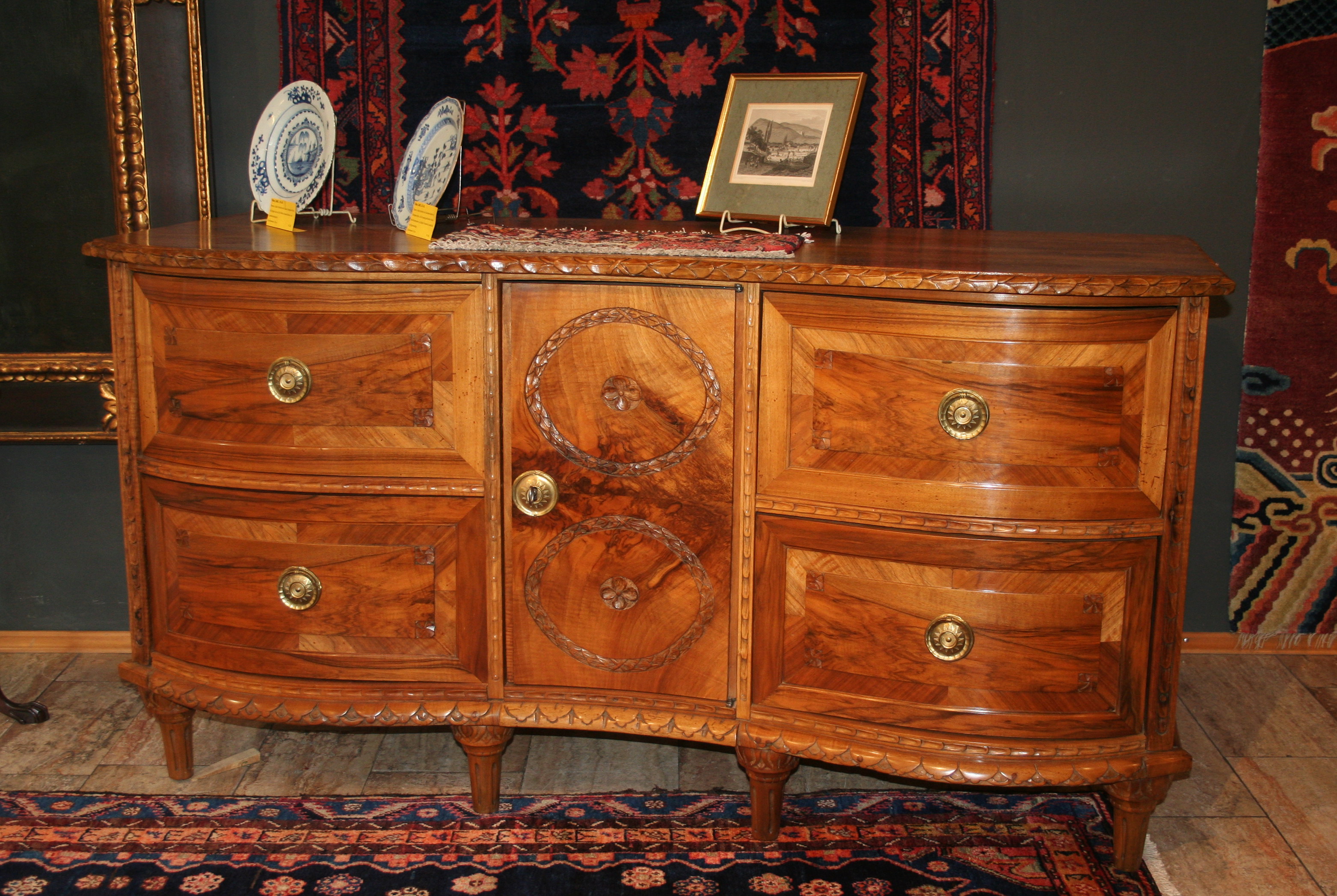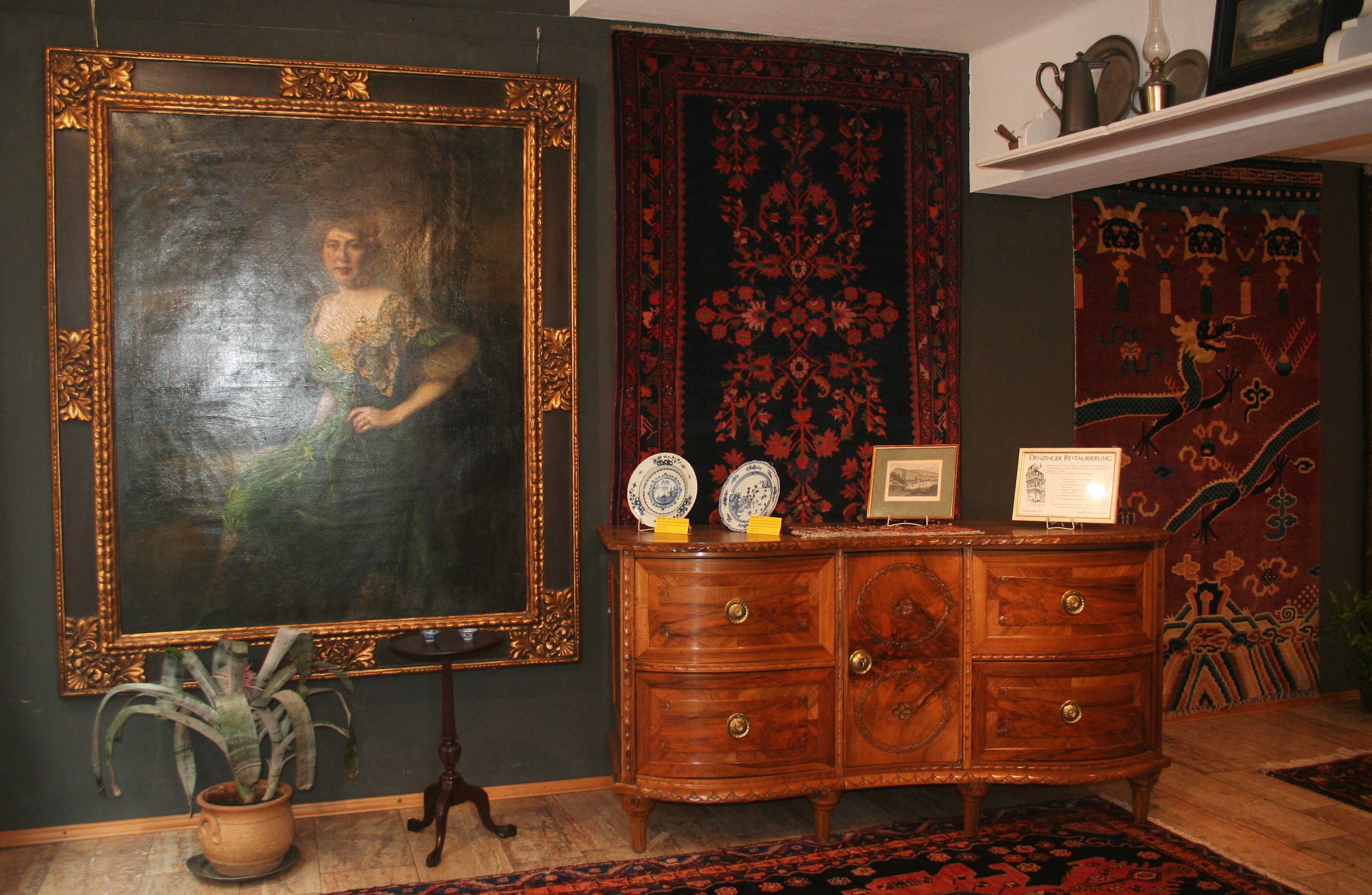 Wie schon zu Anfang des Jahres versprochen, auch im Mai viele Highlights zu unserem diesjährigen 90. Betriebsjubiläum in Neustadt an der Weinstraße. Aus unserem Lager zeigen wir Spitzenstücke der letzten 90 Jahre. Dieses Mal, unter vielem anderen, einen antiken, chinesischen Säulenteppich aus dem Kaiserpalast. Zu erkennen ist das an den fünf Krallen des Drachens, die nur auf Teppichen des Kaiserpalastes verwendet werden durften; natürlich perfekt erhalten und äußerst selten. Eine Hochzeits-Pferdedecke aus dem Kurdengebiet und einen antiken Hadschlu-Bochara. Bei den Möbeln zeigen wir einen frühen Pfälzer Nußbaumschrank in allerhöchster Qualität, eine seltene, kleine Louis Seize Kommode in Nußbaum und Kirsch mit Bandintarsien, einen marketierten Schreibsekretär in Nußbaum, meisterlich gebaut um 1740/50 und eine Anrichte in massiv Nußbaum um 1770, ebenfalls aus der Pfalz. Selbstverständlich wurden alle Möbel in unserer Restaurierungsabteilung von unseren Spezialisten perfekt restauriert. Ganz vorne im Schaufenster zeigen wir ein museales Gemälde der letzten Markgräfin von Baden, des bekannten Hofmalers Otto Propheter.